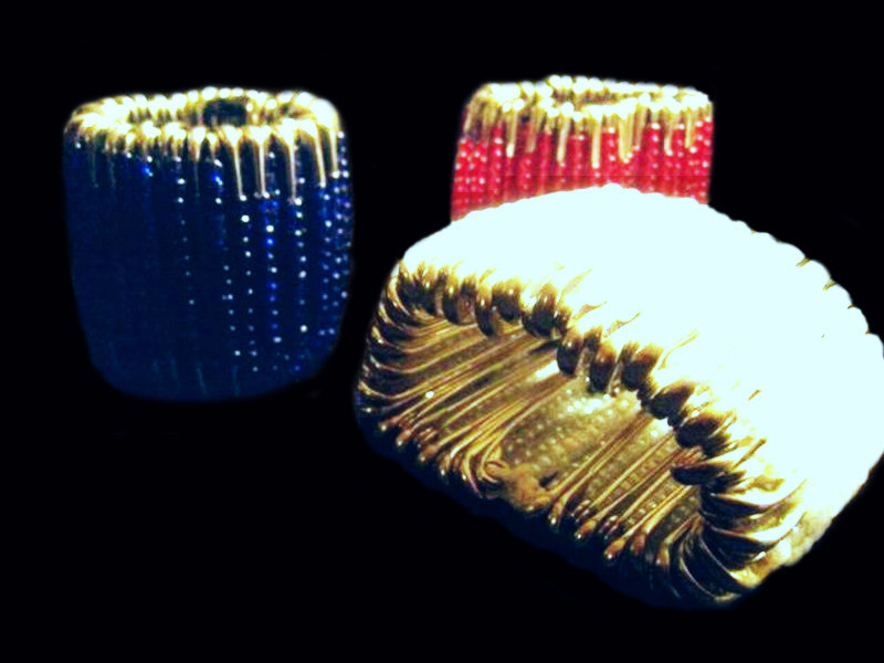 Metall (versilbert) & Baumwollfaden. Es gibt sie in den Farben: Weinrot, Schwarz, Hellblau, Violet.